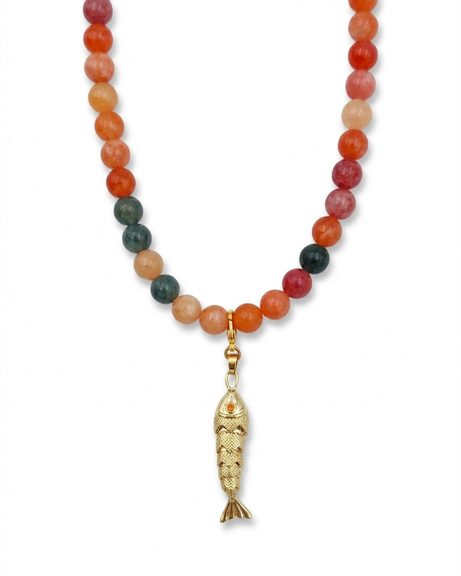 שרשרת קצרה מאבני קוורץ בגווני ירוק, כתמתם ואדום ותליון בצורת דג משובץ זירקון ובעל תנועתיות הניתן להסרה. ניתן לענוד לבד או בשילוב שרשראות נוספות למראה שכבות. האלמנטים בשרשרת בציפוי ישראלי איכותי של זהב 24 קראט. הפריט מגיע ארוז למתנה ועם אחריות לשנה. ניתן להוסיף ברכה אישית ופתק החלפה.