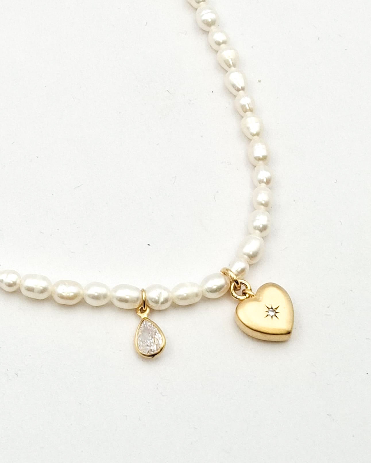 שרשרת פנינים אמתיות קצרה, עדינה וא-סימטרית עם תליון בצורת לב בשיבוץ זירקון שקוף ותליון טיפת זירקון שקוף משובץ. האלמנטים בציפוי ישראלי איכותי של זהב 24 קראט  שרשרת קצרה שניתן לענוד לבד או בשילוב שרשראות נוספות.