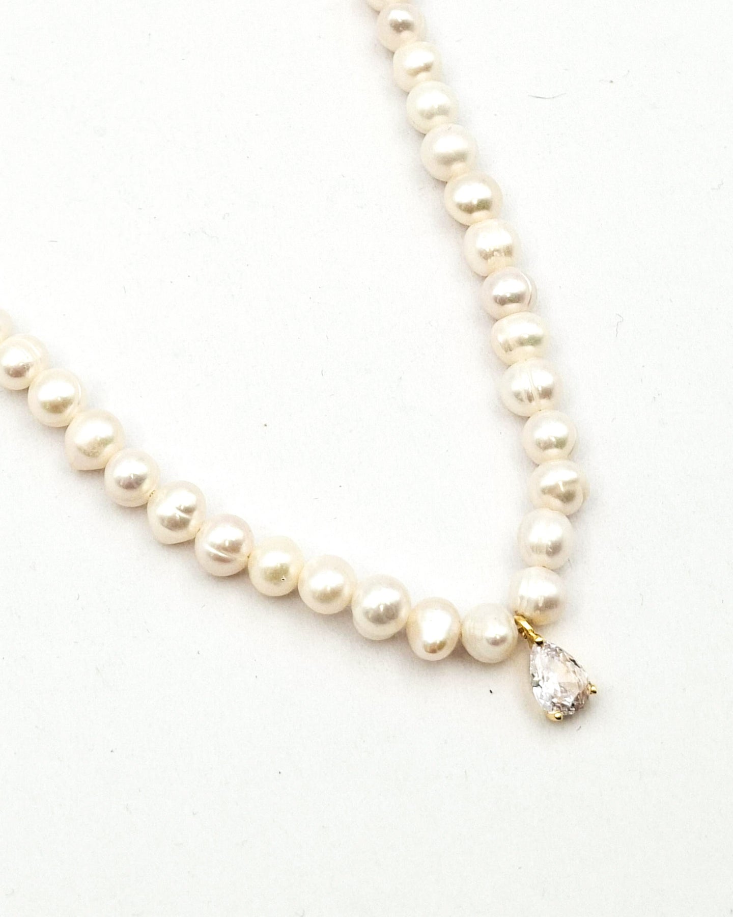 שרשרת קצרה קלאסית ומקסימה של פנינים אמתיות עגלגלות בגודל בינוני, עם תליון של זירקון שקוף בצורת טיפה. ניתן לענוד לבד או בשילוב שרשראות נוספות. השרשרת בציפוי ישראלי איכותי של זהב 24 קראט. הפריט מגיע ארוז למתנה ועם אחריות לשנה. ניתן להוסיף ברכה אישית ופתק החלפה.