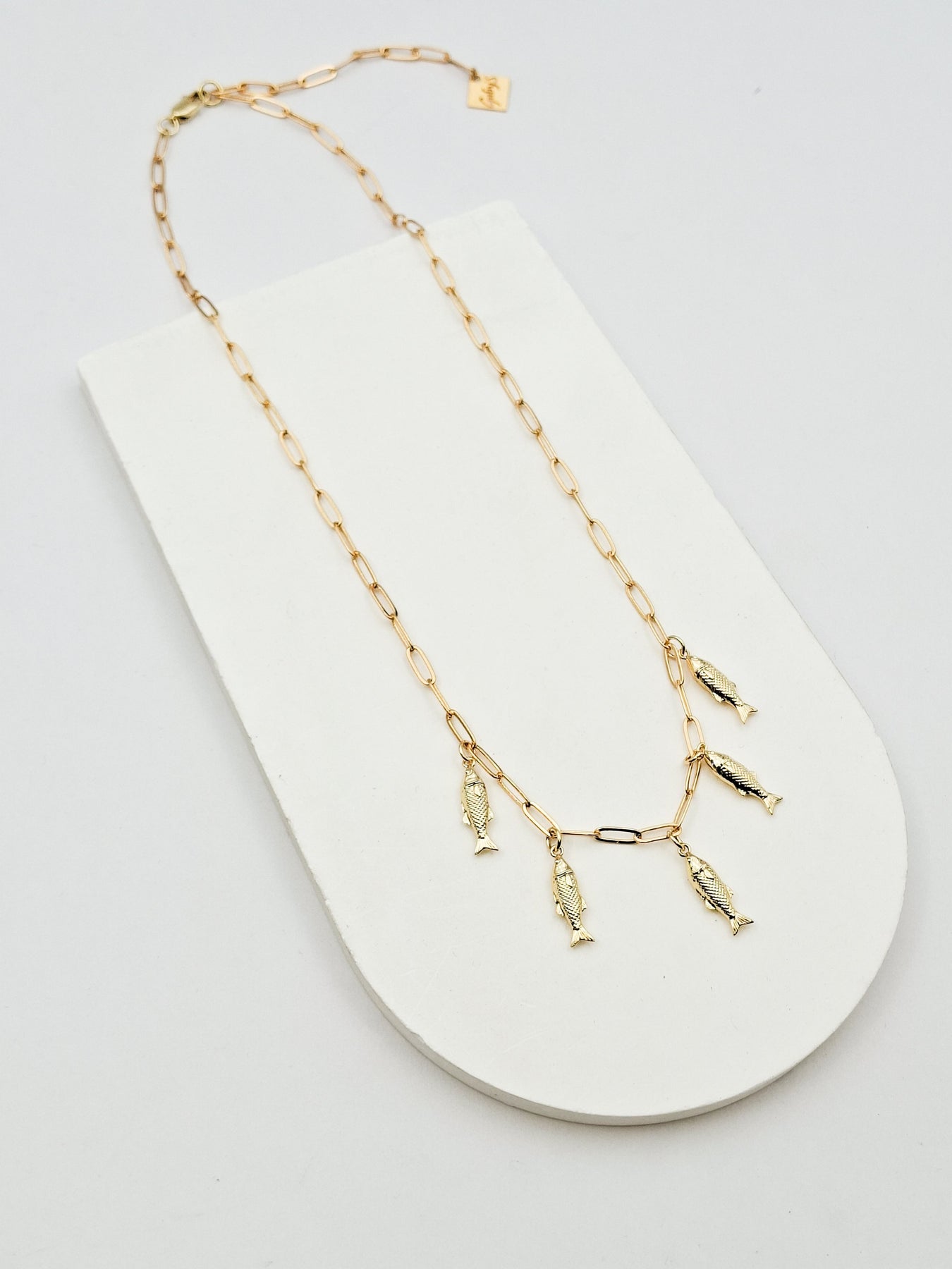 שרשרת קצרה ומהממת בצורת חוליות מלבניות עם חמישה תליונים של דגים קטנים. השרשרת בציפוי ישראלי איכותי של זהב 24 קראט. הפריט מגיע ארוז למתנה ועם אחריות לשנה. ניתן להוסיף ברכה אישית ופתק החלפה.