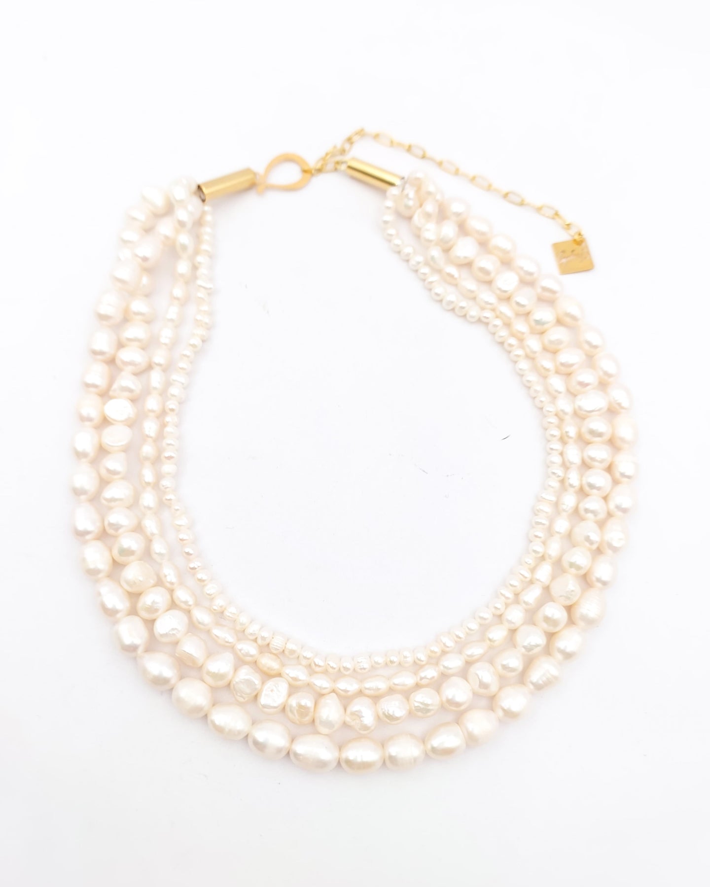 שרשרת פנינים קצרה וסופר מרשימה המורכבת מ-4 שכבות של שורות פנינים אמתיות בגדלים וצורות שונות. האלמנטים בציפוי איכותי ישראלי של זהב 24 קראט או כסף, לבחירתך.