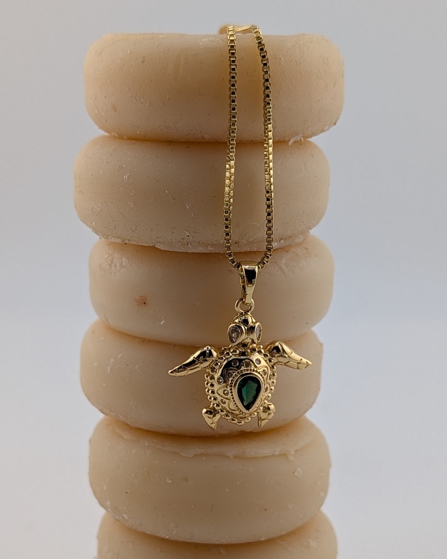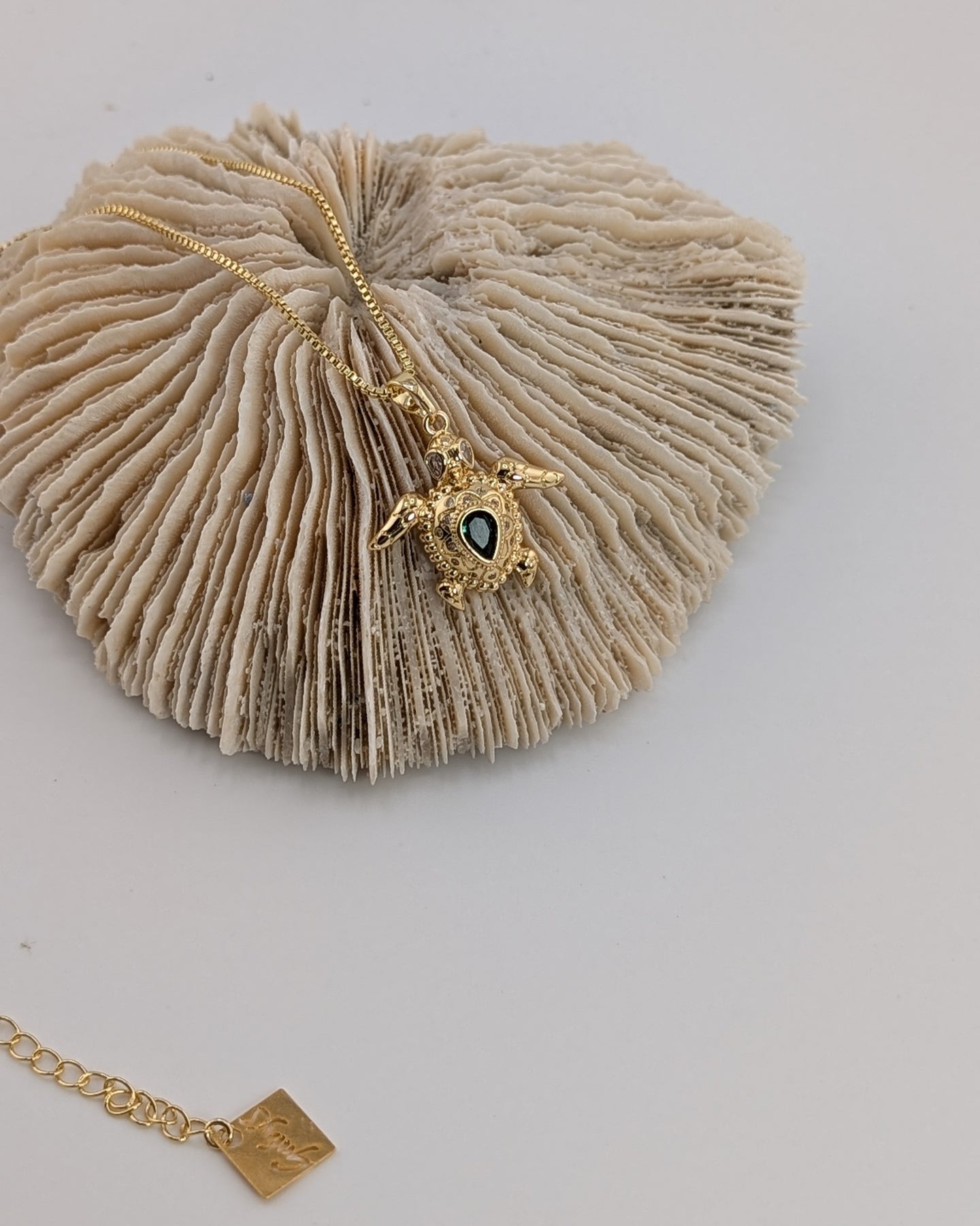 שרשרת קצרה בציפוי איכותי ישראלי של זהב 24 קראט עם תליון מרכזי בצורת צב משובץ זירקון ירוק בצורת טיפה וזירקונים שקופים.