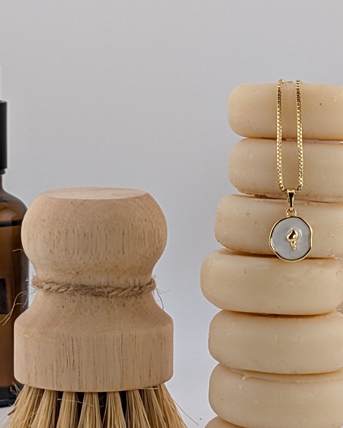 שרשרת קצרה בציפוי איכותי ישראלי של זהב 24 קראט עם תליון של מטבע עם אמייל בגוון לבחירתך ותבליט בצורת קונכיה.