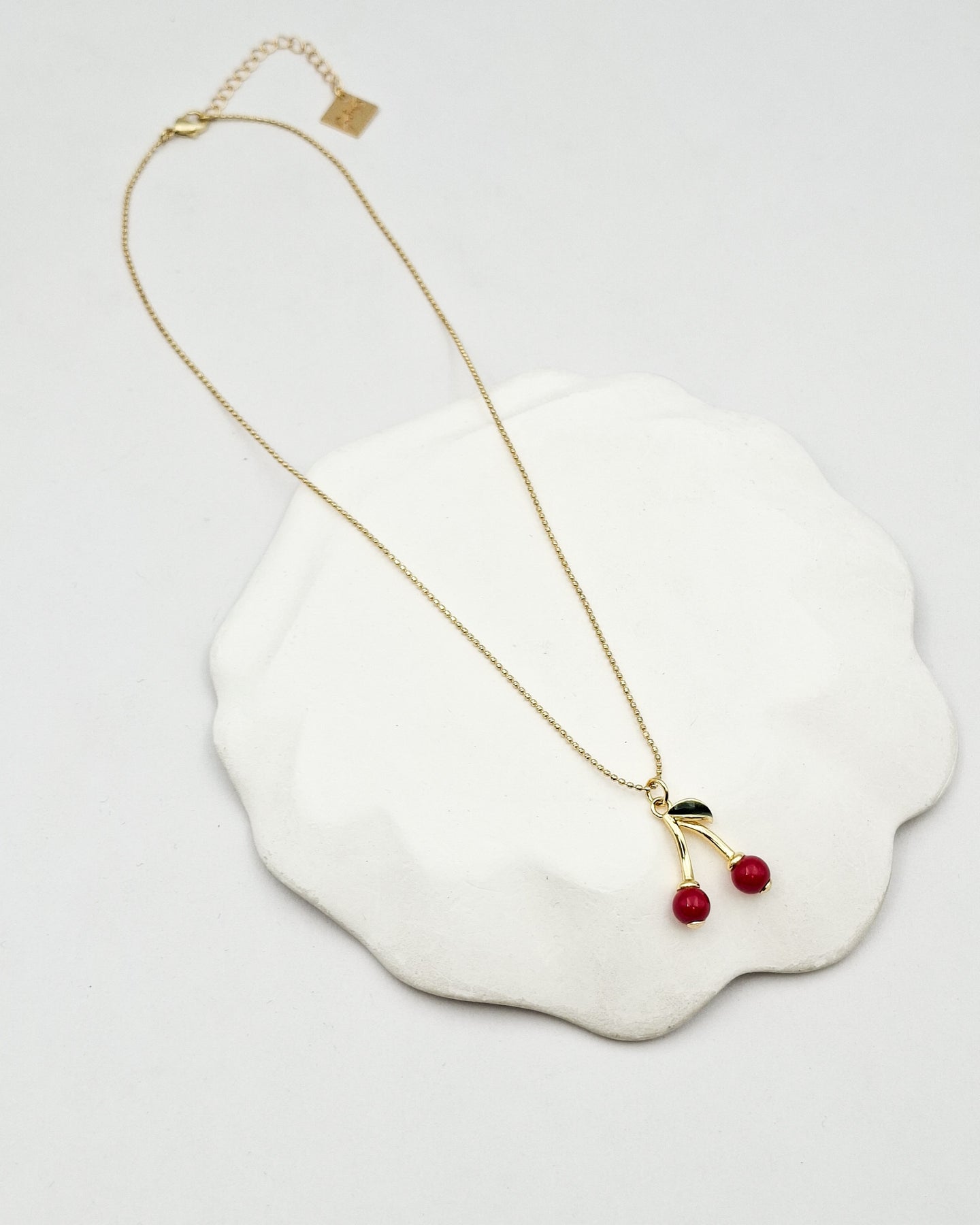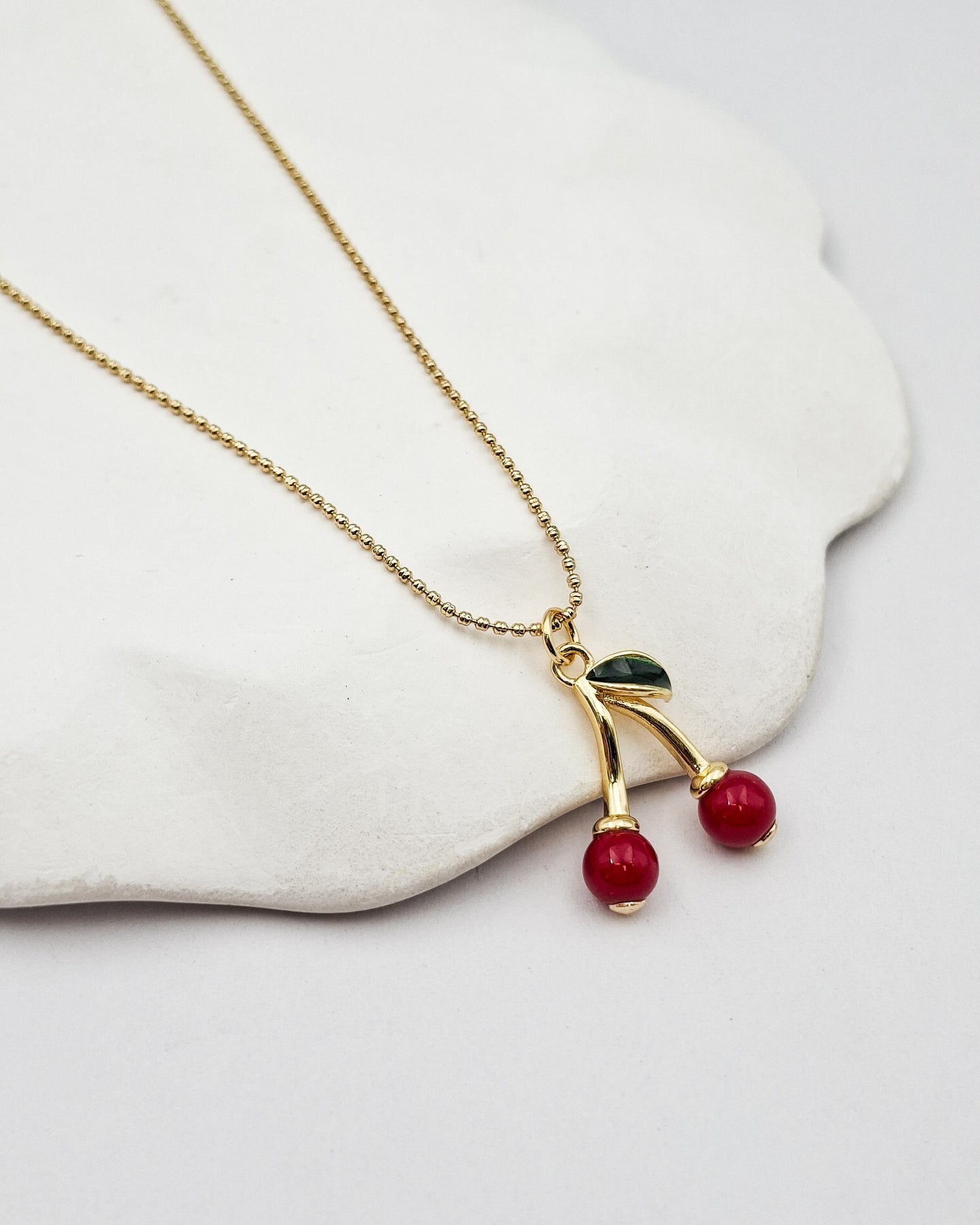 שרשרת כדוריות קצרה בציפוי איכותי ישראלי של זהב 24 קראט עם תליון בצורת דובדבנים עם אמייל. השרשרת בציפוי היפואלרגני.