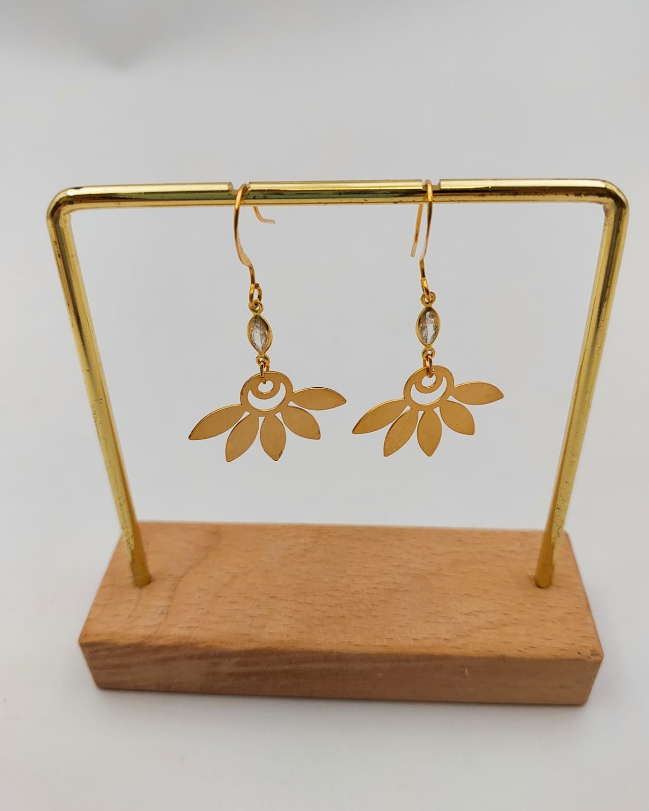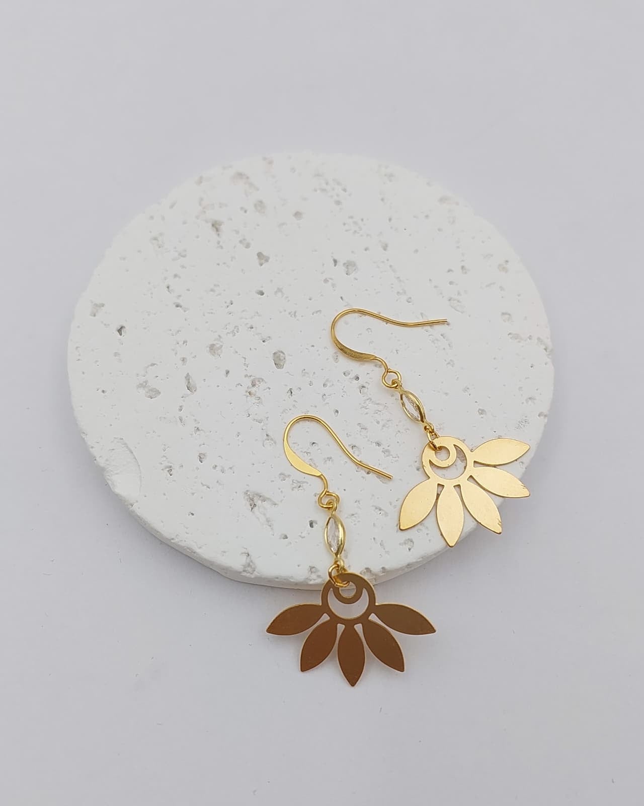 עגילים תלויים עם אלמנט בצורת חצי פרח וזירקון בצורת טיפה. העגילים בציפוי ישראלי איכותי של זהב 24 קראט. תולה העגיל הינו היפו אלרגני. הפריט מגיע ארוז למתנה ועם אחריות לשנה. ניתן להוסיף ברכה אישית ופתק החלפה.