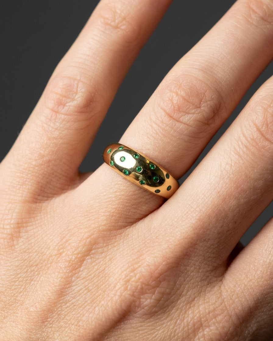 טבעת מקסימה בשיבוץ זירקונים קטנים בגוון ירוק ובסיס המתכוונן לכל מידה. הטבעת בציפוי ישראלי איכותי והיפואלרגני של זהב 24 קראט. הפריט מגיע ארוז למתנה ועם אחריות לשנה. ניתן להוסיף ברכה אישית ופתק החלפה.