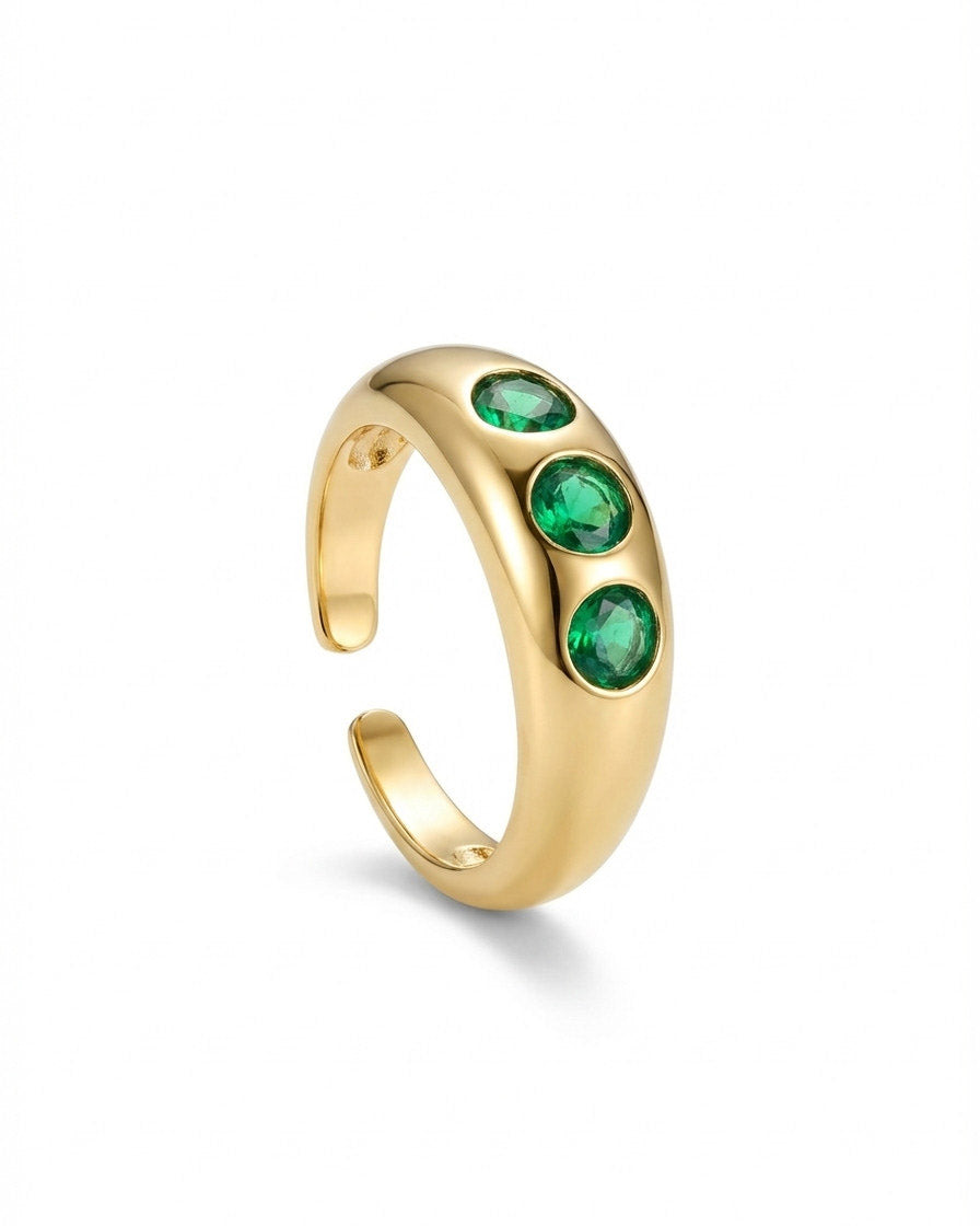 טבעת מהממת בשיבוץ 3 זירקונים ירוקים עגולים גדולים ובסיס המתכוונן לכל מידה. הטבעת בציפוי ישראלי איכותי והיפואלרגני של זהב 24 קראט. הפריט מגיע ארוז למתנה ועם אחריות לשנה. ניתן להוסיף ברכה אישית ופתק החלפה.