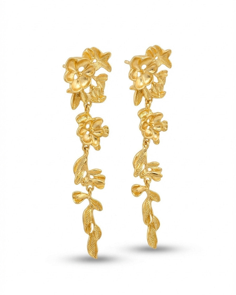 עגילים צמודים מיוחדים וארוכים בעלי תנועתיות מרהיבה, מורכבים אלמנטים בצורת פרחים ועלים. העגילים בציפוי ישראלי איכותי של זהב 24 קראט או כסף בגימור מט, לבחירתך. הפריט מגיע ארוז למתנה ועם אחריות לשנה. ניתן להוסיף ברכה אישית ופתק החלפה.