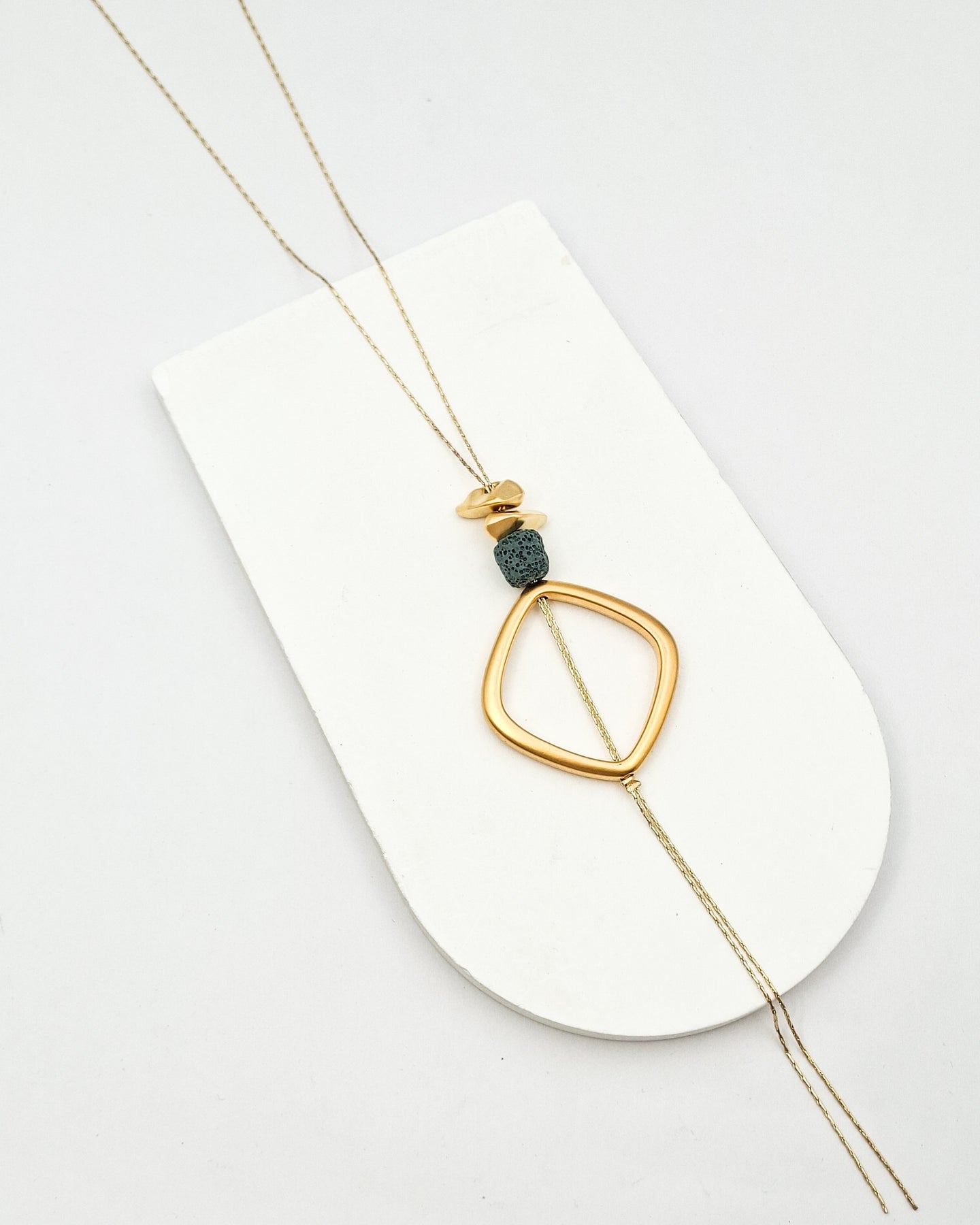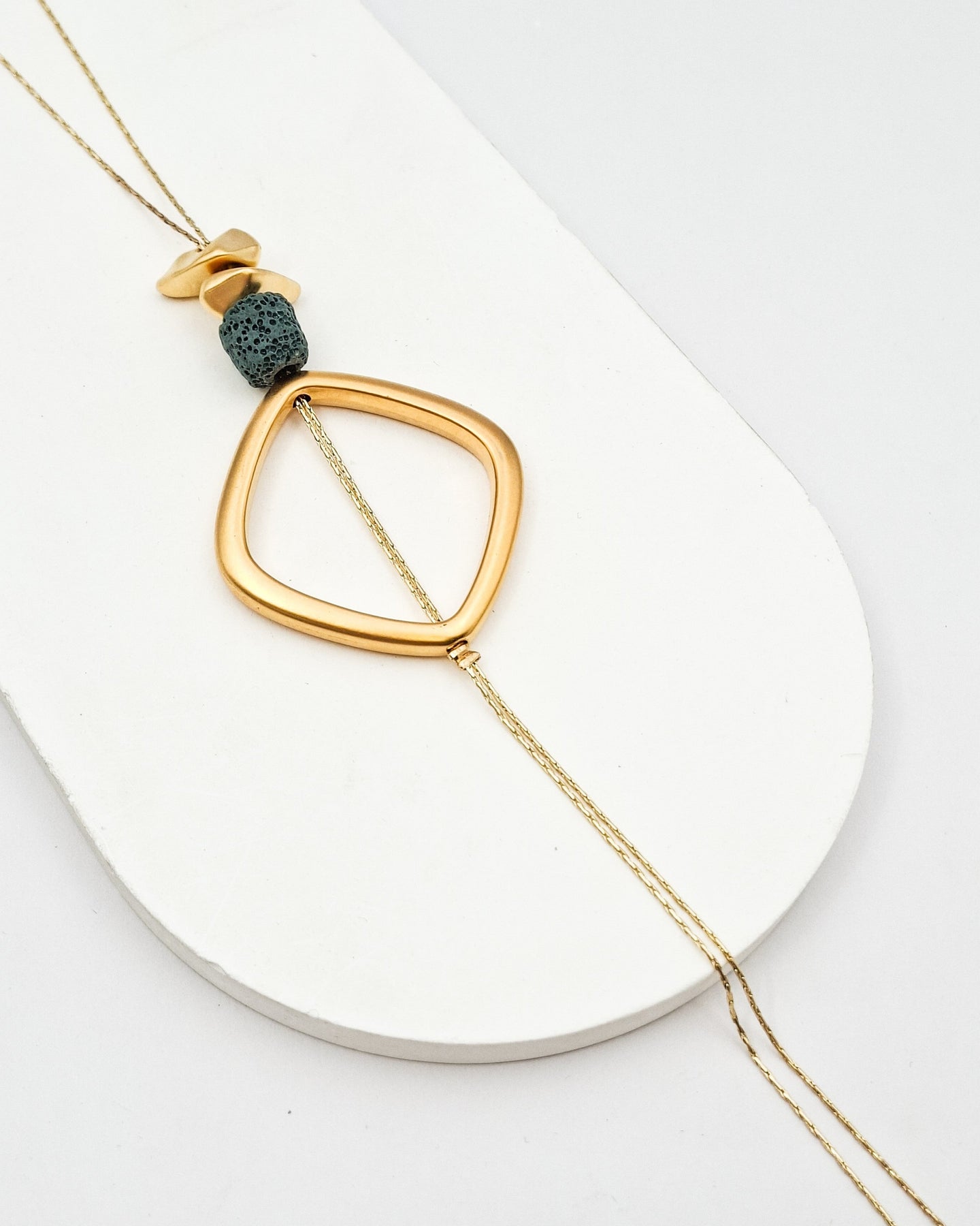שרשרת קלאסית בצורת עניבה עם תליון המורכב מאלמנט חלול בצורת מעוין, אלמנטים אסימטריים בעלי נפח בשילוב אבן בזלת בגוון ירוק חאקי. השרשרת והתליון בציפוי ישראלי איכותי של זהב 24 קראט ובגימור מט. הפריט מגיע ארוז למתנה ועם אחריות לשנה. ניתן להוסיף ברכה אישית ופתק החלפה